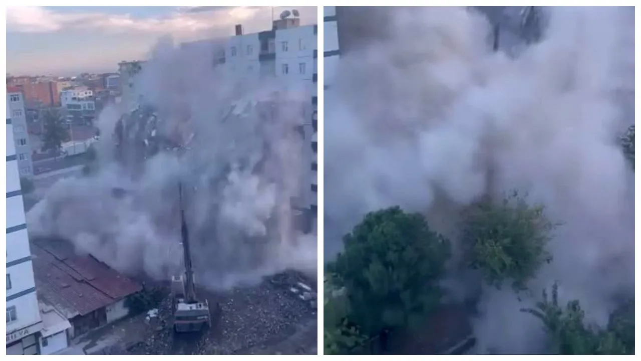 Kahramanmaraş merkezli depremlerden etkilenen Diyarbakır’da, yıkım çalışmaları sürerken dikkat çeken bir görüntü ortaya çıktı. Bağlar ilçesinde ağır hasarlı 8 katlı bir bina, iş makinesinin tek dokunuşuyla saniyeler içinde yerle bir oldu. 2023 yılında yaşanan büyük depremlerde ağır hasar aldığı tespit edilen bina, güvenlik riski oluşturduğu gerekçesiyle yıkım programına alındı. Merkez Bağlar ilçesindeki Cezaevi Üst Köşe semtinde bulunan binanın bir bölümü daha önce çökmüş, kalan kısmı ise kontrollü şekilde yıkılmak üzere iş makineleriyle müdahale edildi.
