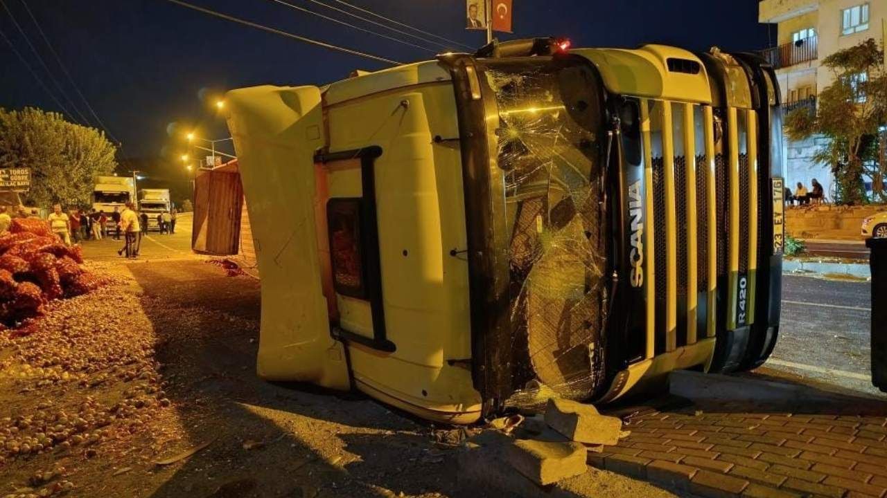 Kaza sonrası soğan yüklü tır devrilerek yol kenarına savruldu. Kasasında bulunan tonlarca soğan yola saçılırken, devrilen tırın sürücüsü yaralandı. Olay yerine sevk edilen sağlık ekipleri, yaralı sürücüye ilk müdahaleyi yaptıktan sonra hastaneye kaldırdı.