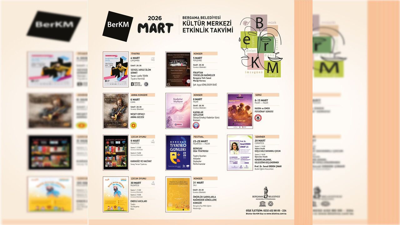 5 Mart’ta Bergama Türk Sanat Müziği Korosu, şef Ayça Gönlügür İduğ yönetiminde "Pikaptan Yükselen Nağmeler" konseriyle sahne alacak. 6 Mart’ta ise Eğitim-SEN Bergama Temsilciliği’nin katkılarıyla Türk Halk Müziği’nin unutulmaz ismi Neşet Ertaş anısına düzenlenecek programda duygu dolu anlar yaşanacak. 8 Mart Dünya Emekçi Kadınlar Günü kapsamında Eğitim-İŞ Sendikası Bergama Temsilciliği katkısıyla düzenlenecek "Kadınlar Söylüyor" konserinde kadın sanatçılar sahne alacak. Ayın kapanışı ise 31 Mart’ta Bergama İlçe Milli Eğitim Müdürlüğü iş birliğiyle gerçekleştirilecek "Ömürlük Şarkılarla Nağmeden Gönüllere" konseriyle yapılacak.