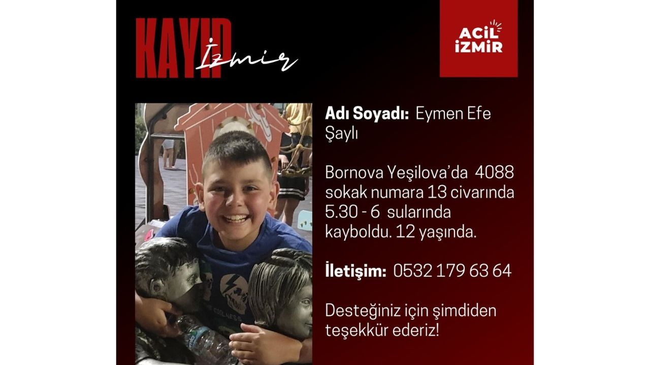 İzmir’in Bornova ilçesinde yaşayan 12 yaşındaki Eymen Efe Şaylı’dan saat 18.30 sıralarından bu yana haber alınamıyor. Küçük çocuğun kaybolması üzerine ailesi ve çevredeki vatandaşlar endişe dolu bekleyişe geçti.