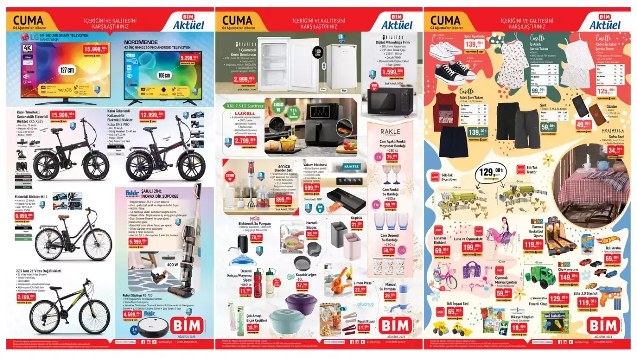 BİM, 4-8 Ağustos tarihleri arasında geçerli olacak yeni indirimli aktüel ürünler kataloğunu resmi internet sitesi üzerinden duyurdu. Alışverişlerinde ekonomiyi ve kaliteyi bir arada arayan vatandaşların gözdesi olan BİM, bu hafta da çeşitli indirimlerle tüketicilere cazip fırsatlar sunmaya hazırlanıyor.