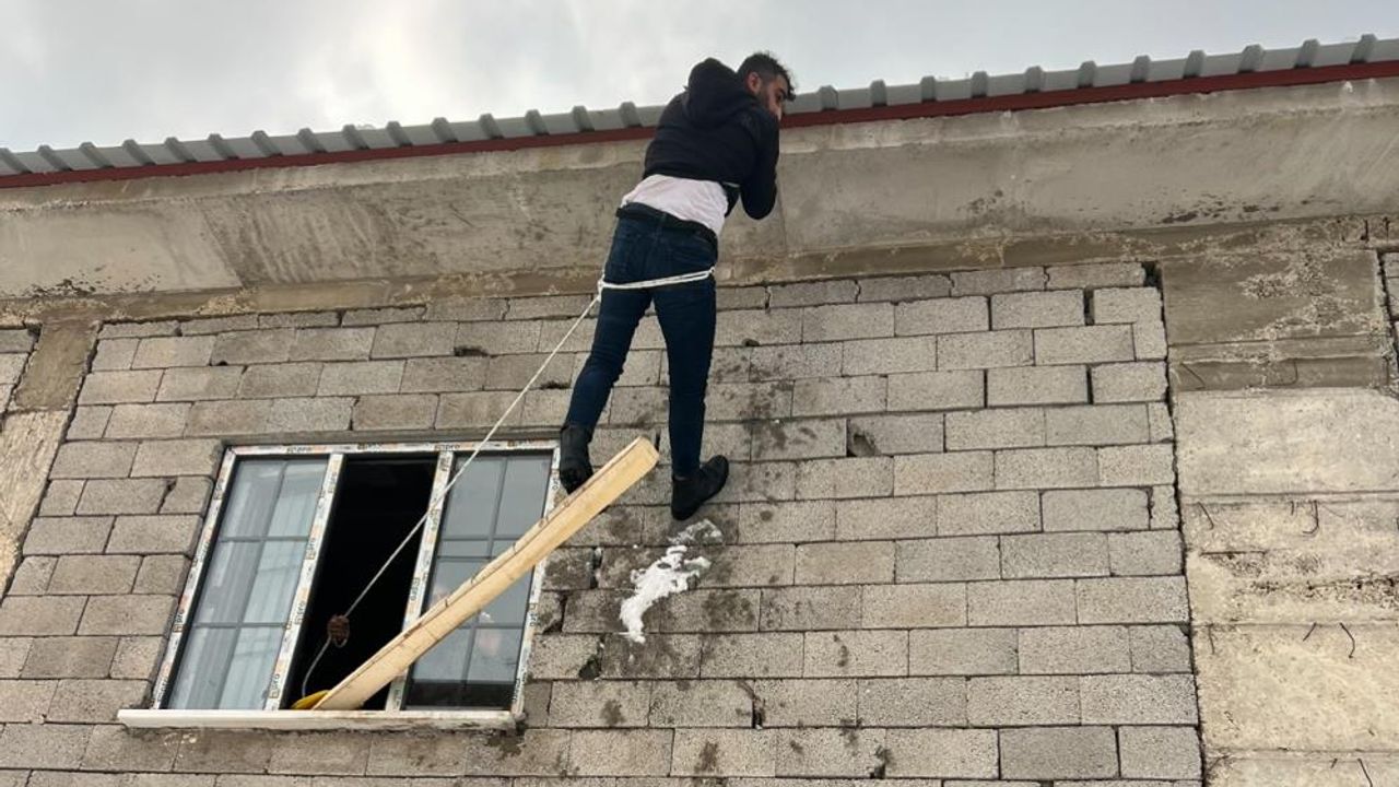Hakkari’nin Yüksekova ilçesinde temizlik yaptığı çatıda ayağı kayan vatandaş, beline bağladığı ip sayesinde boşlukta asılı kalarak hayata tutundu. Şahıs, itfaiye ekiplerince merdivenli araçla kurtarıldı.