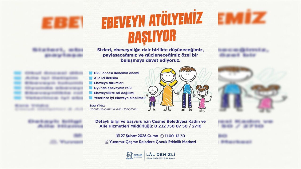 Çeşme Belediyesi, ailelerin ebeveynlik sürecinde desteklenmesi amacıyla yeni bir çalışmayı hayata geçiriyor. Kadın ve Aile Hizmetleri Müdürlüğü koordinasyonunda düzenlenecek Ebeveyn Atölyesi, 27 Şubat 2026 Cuma günü saat 11.00–12.30 arasında Yuvamız Çeşme Reisdere Çocuk Etkinlik Merkezi’nde gerçekleştirilecek. Atölye çalışmasında okul öncesi dönemin önemi, aile içi iletişim, ebeveyn tutumları, oyunda ebeveynin rolü, ebeveynlikte rol paylaşımı ve yeterince iyi ebeveyn olabilme gibi konular ele alınacak. Katılımcıların deneyimlerini paylaşabileceği buluşmada, ebeveynliğe dair güncel yaklaşımlar da değerlendirilecek.