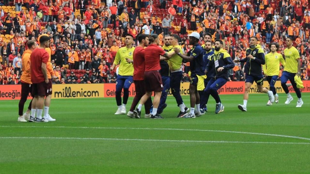 Trendyol Süper Lig'in 37. haftasında saat 19.00'da Galatasaray ve Fenerbahçe, RAMS Park'ta karşı karşıya gelecek. Şampiyonluğu yakından ilgilendiren bu zorlu derbi başlamadan sahada gerginlik yaşandı. İki takımın futbolcuları da zemin kontrolü için sahaya çıktığı sırada sarı-kırmızılı oyuncu Kerem Aktürkoğlu ile sarı-lacivertli futbolcu Mert Hakan Yandaş arasında sözlü atışma oldu. Galatasaraylı bir diğer futbolcu Abdülkerim Bardakcı'nın da Yandaş'a fiziki temasta bulunmasıyla gerilim büyüdü.