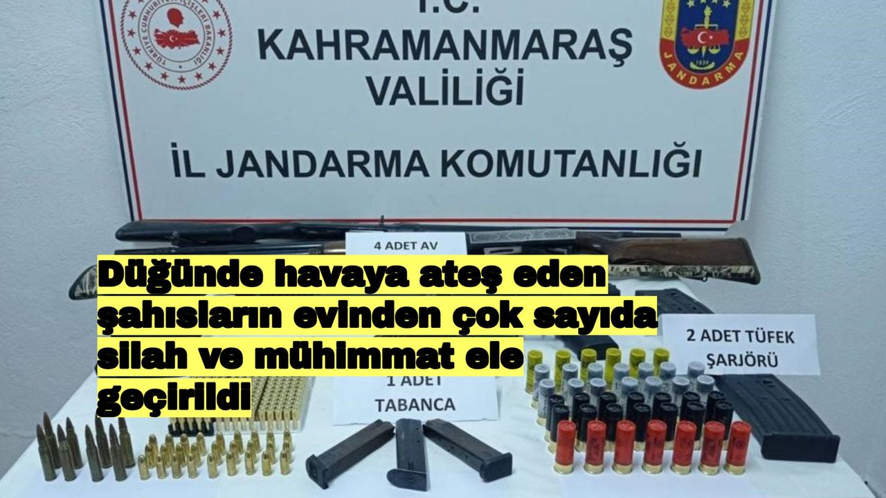 Edinilen bilgiye göre, Kahramanmaraş İl Jandarma Komutanlığı ekipleri, Afşin ilçesinde düğünde havaya rastgele ateş açan ve o anların görüntülerini sosyal medya hesaplarından paylaşan şahısları tespit etti. Yapılan araştırmalar neticesinde şüphelilerden H.P. (26), F.P. (23), M.P. (33), O.P. (29) isimli şahısların evlerinde yapılan aramalarda 1 ruhsatsız tabanca, 2 tabancaya ait şarjör, 9 minimetre çapında 350 fişek, 4 av tüfeği, 2 tüfeğe ait şarjör, 7.62 çapında 8 fişek ve 2 adet kurusıkı tabancaya ait şarjör ele geçirildi. Şüphelilerin yakalanması için çalışma başlatıldı.
