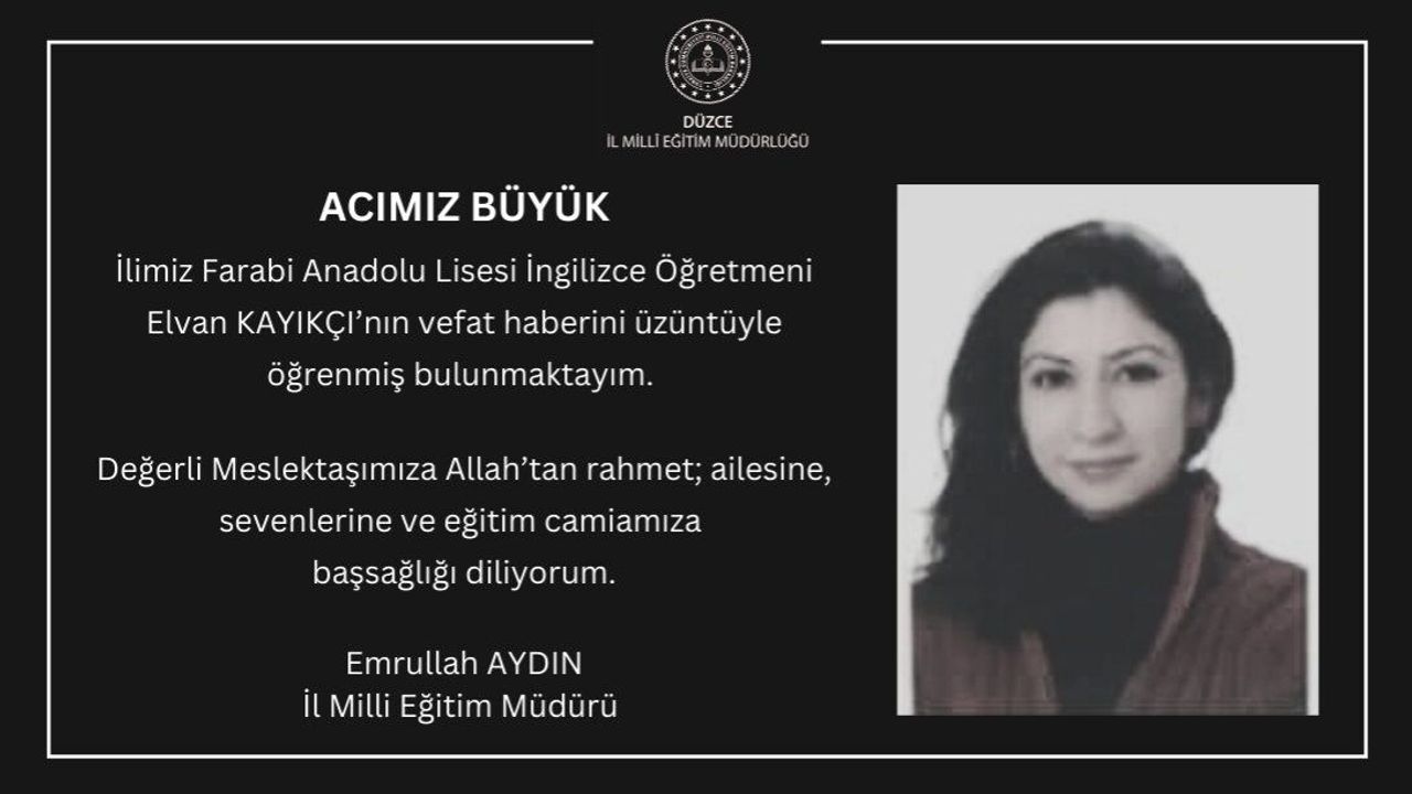 Düzce İl Milli Eğitim Müdürlüğü tarafından yapılan açıklamada, "İlimiz Farabi Anadolu Lisesi İngilizce Öğretmeni Elvan Kayıkçı'yı kaybetmenin derin üzüntüsünü yaşıyoruz. Merhum öğretmenimize Allah'tan rahmet; ailesine, sevenlerine ve eğitim camiamıza başsağlığı diliyoruz." ifadelerine yer verildi.