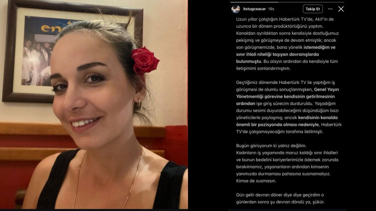 Habertürk TV’de uzun yıllar prodüktörlük yapan Tuğçe Acar, sosyal medya hesabı üzerinden yaptığı açıklamayla kamuoyunda geniş yankı uyandırdı. Acar, Habertürk Genel Yayın Yönetmeni Mehmet Akif Ersoy hakkında geçmişte yaşadığı bir olayı paylaşarak, mesleki sürecinin nasıl etkilendiğini açıkladı.