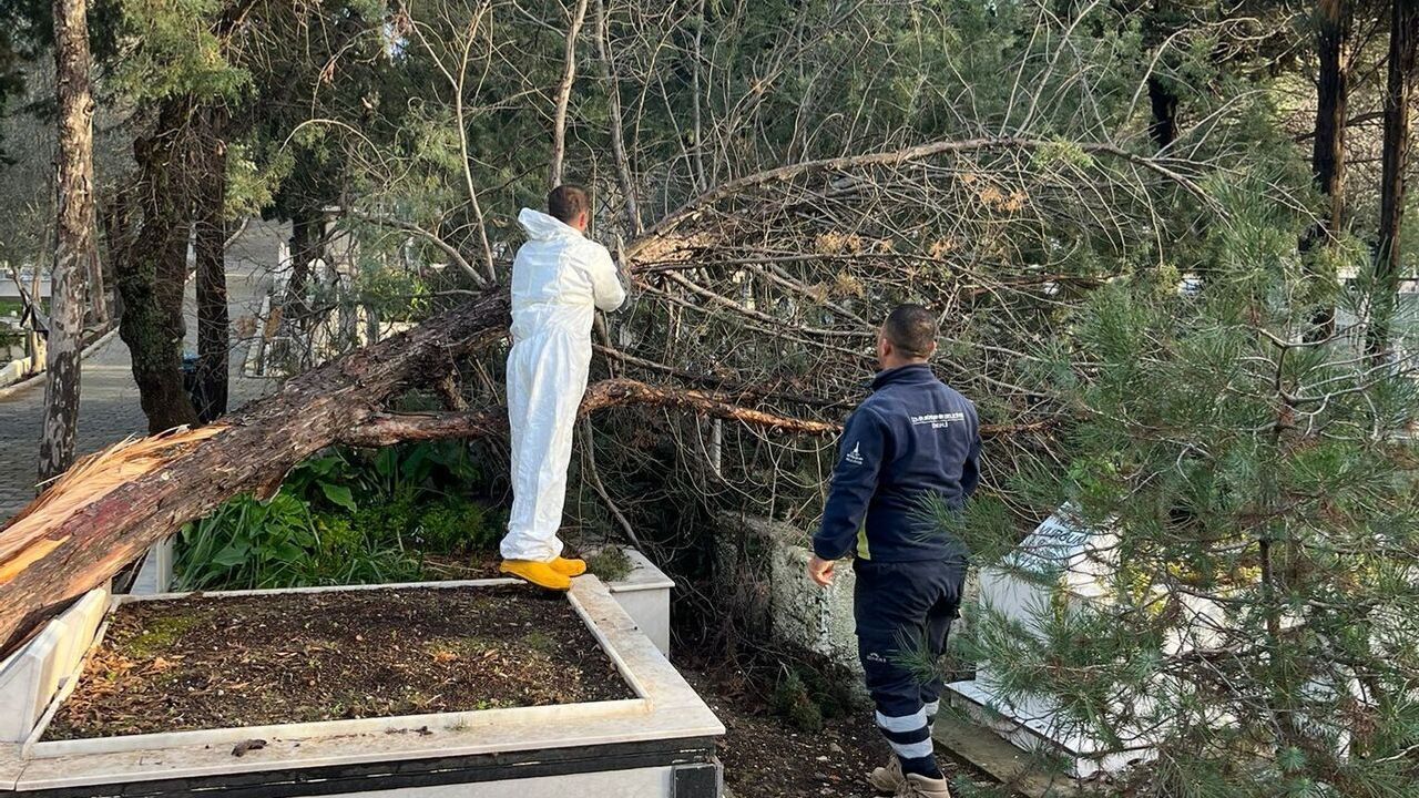 İzmir’de geçtiğimiz gün etkili olan şiddetli yağış ve fırtına, kent genelinde hayatı olumsuz etkilerken mezarlıklarda da ciddi hasara neden oldu. Olumsuz hava koşulları nedeniyle çok sayıda mezarlıkta ağaçlar devrildi, bazı mezarlar zarar gördü. İzmir Büyükşehir Belediyesi Mezarlıklar Dairesi Başkanlığı ekipleri, gelen ihbarların ardından kısa sürede sahaya inerek devrilen ağaçları kesip kaldırdı. Hasar gören mezarların onarımı için de çalışmalar başlatıldı.