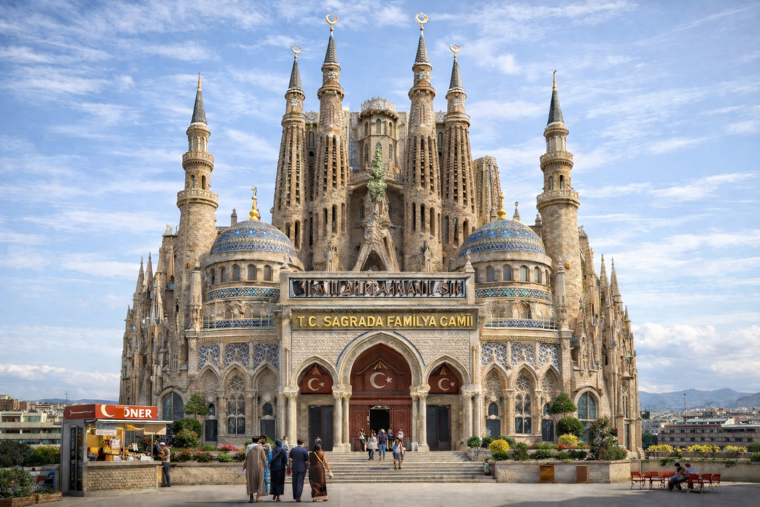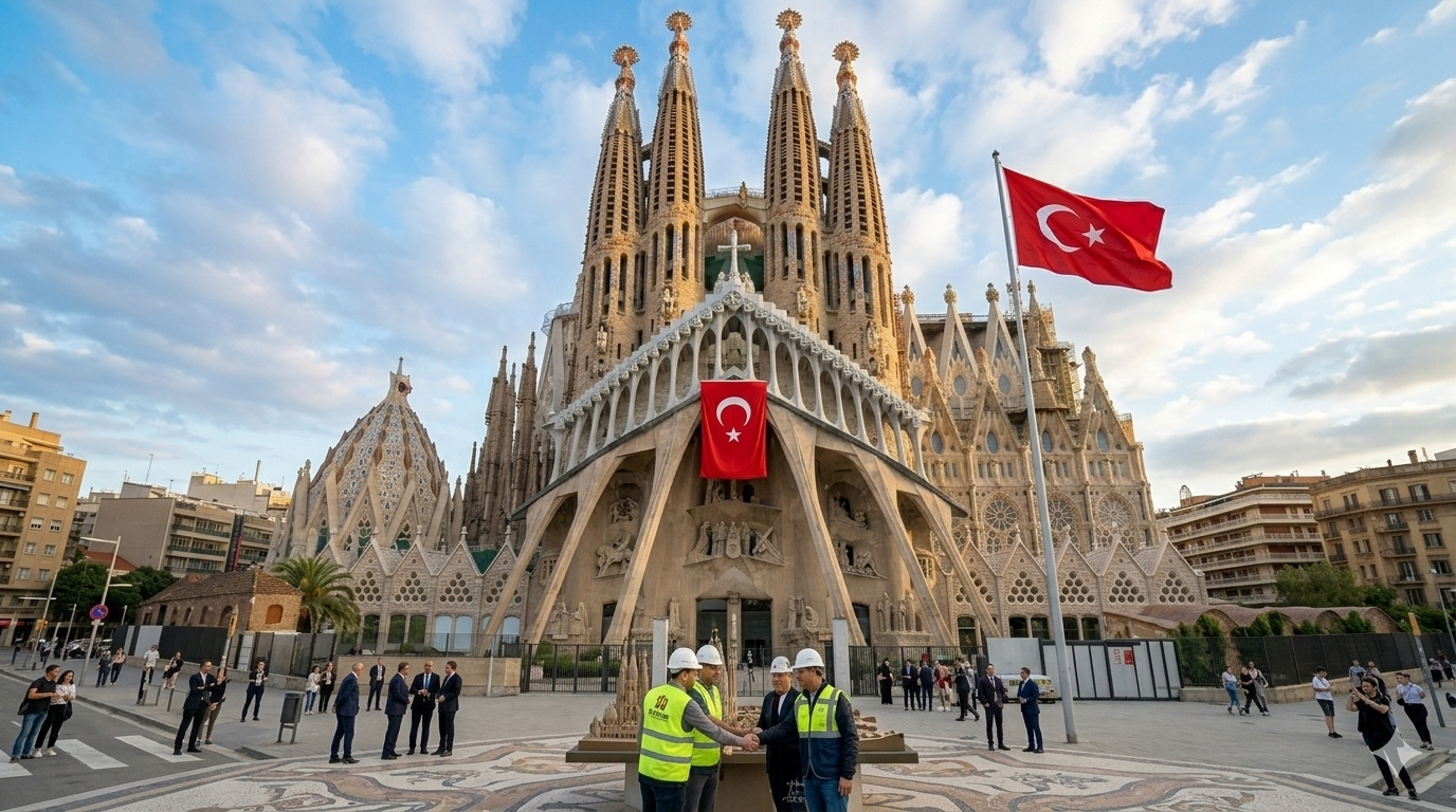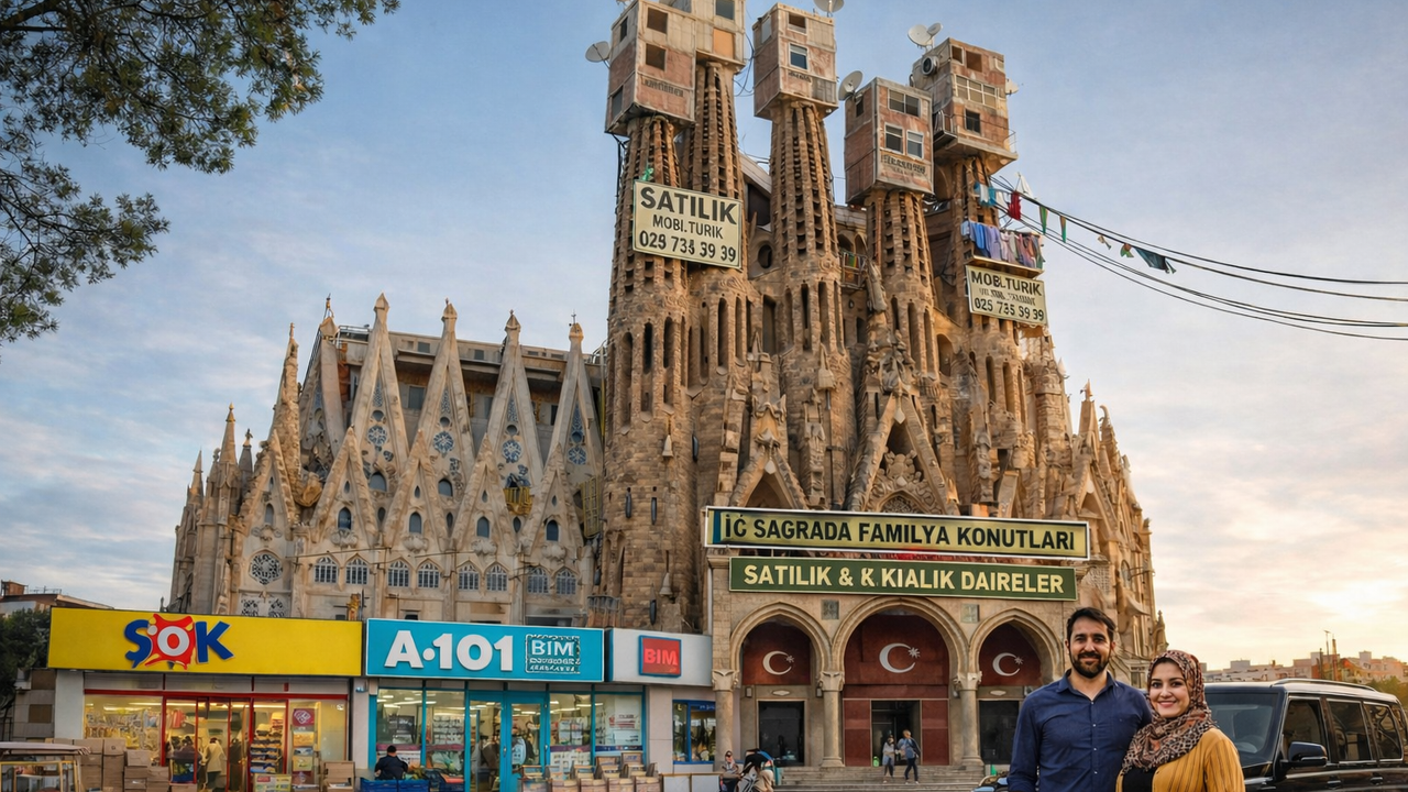 Son günlerde sosyal medyada dolaşıma giren yapay zekâ üretimi görseller, La Sagrada Familia’nın Türk ustaların elinden çıkmış olsaydı nasıl görünebileceğini mizahi bir dille hayal ediyor. Görsellerde tarihi yapı; Türk bayrakları, cami mimarisi, mahalle esnafı tabelaları ve günlük şehir hayatı detaylarıyla yeniden yorumlanıyor.