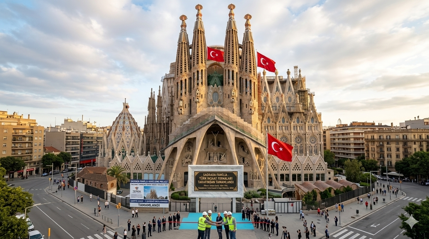 Görsellerden birinde La Sagrada Familia’nın önünde Türk bayrakları dalgalanıyor ve yapı neredeyse tamamlanmış gibi görünüyor. İnşaat işçileri ve yetkililer sembolik bir törenle el sıkışırken, yapının önünde “Türk inşaat firmaları tarafından tamamlandı” mesajı dikkat çekiyor. Bu sahne, sosyal medyada sıkça dile getirilen “Türk müteahhitler yapsaydı çoktan bitmişti” esprisini görselleştiriyor.