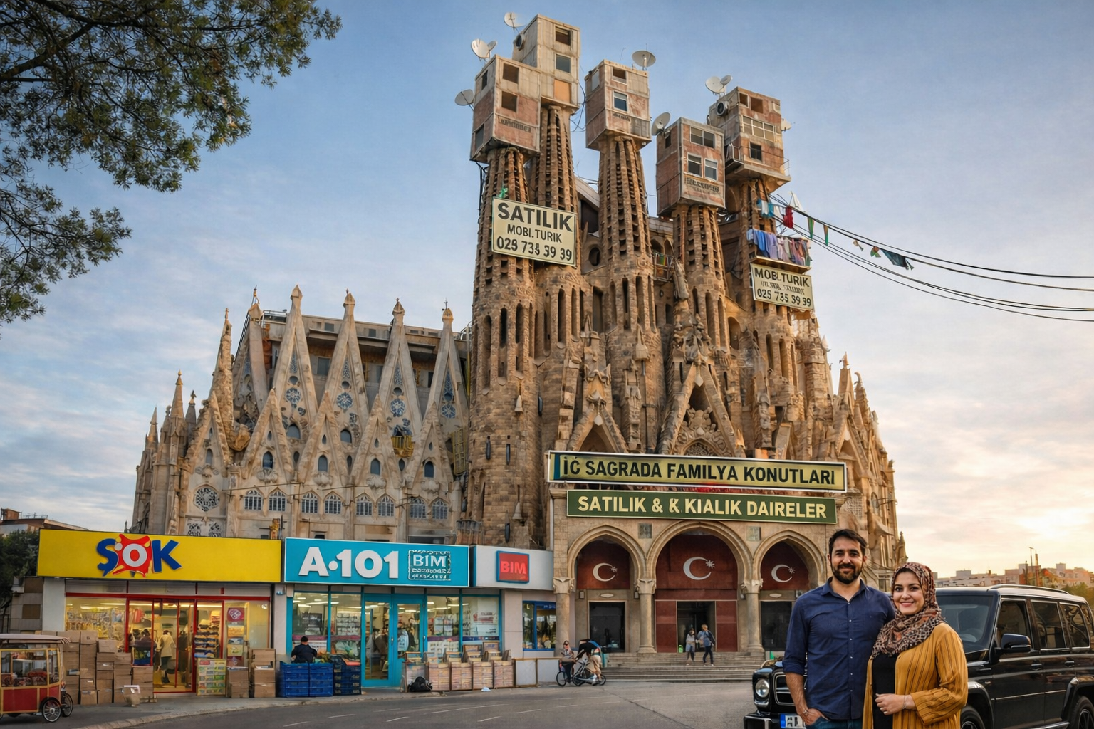 Bir başka görselde ise La Sagrada Familia’nın çevresi adeta bir Türk mahallesine dönüşmüş durumda. Yapının girişinde “Satılık ve Kiralık Daireler” tabelaları yer alırken, alt katlarda Türkiye’de sık görülen zincir marketler ve dükkân tabelaları bulunuyor.
