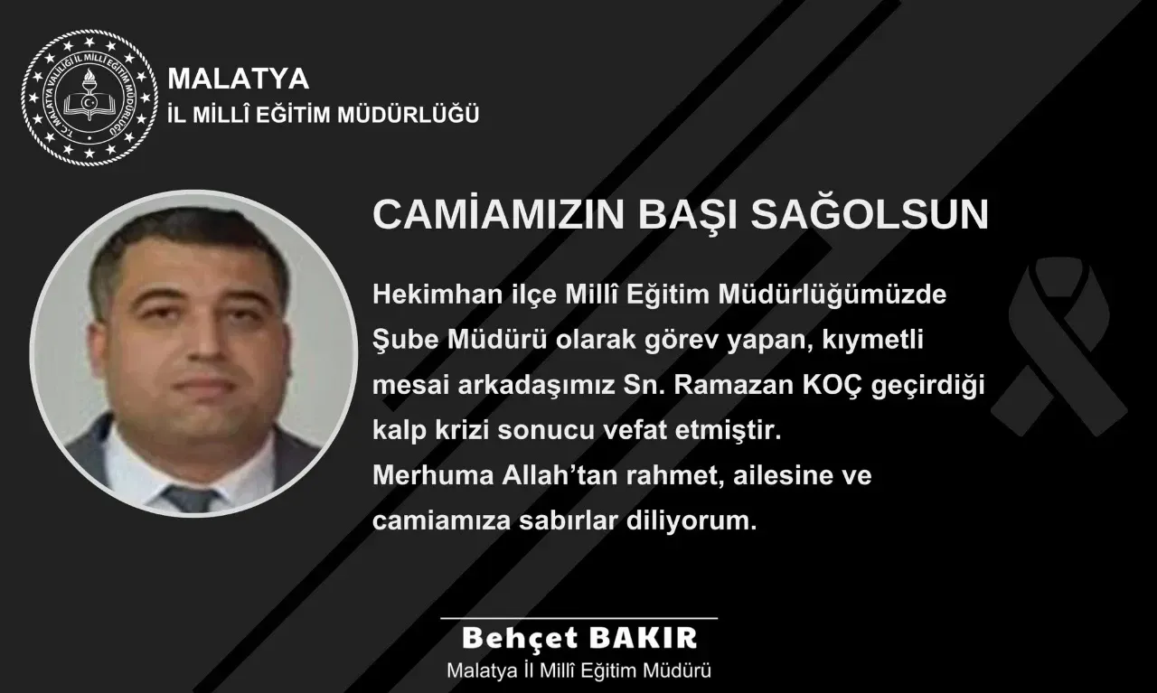 Malatya’nın Hekimhan ilçesinde İlçe Milli Eğitim Şube Müdürü olarak görev yapan Ramazan Koç, geçirdiği kalp krizi sonucu yaşamını yitirdi. Koç’un vefatı, eğitim camiasında büyük üzüntüye neden oldu.