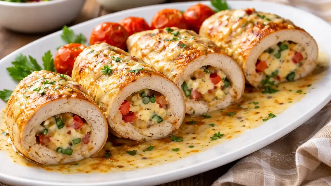 Fırında pişerken içindeki peynir ve sebzelerle aromasını yoğunlaştıran tavuk rulosu, kesildiğinde ortaya çıkan katmanlı görünümüyle iştah açıyor. Lezzeti kadar sunum gücüyle de dikkat çeken bu tarif, özellikle misafir sofralarında iddialı ama zahmetsiz bir seçenek olarak öne çıkıyor.