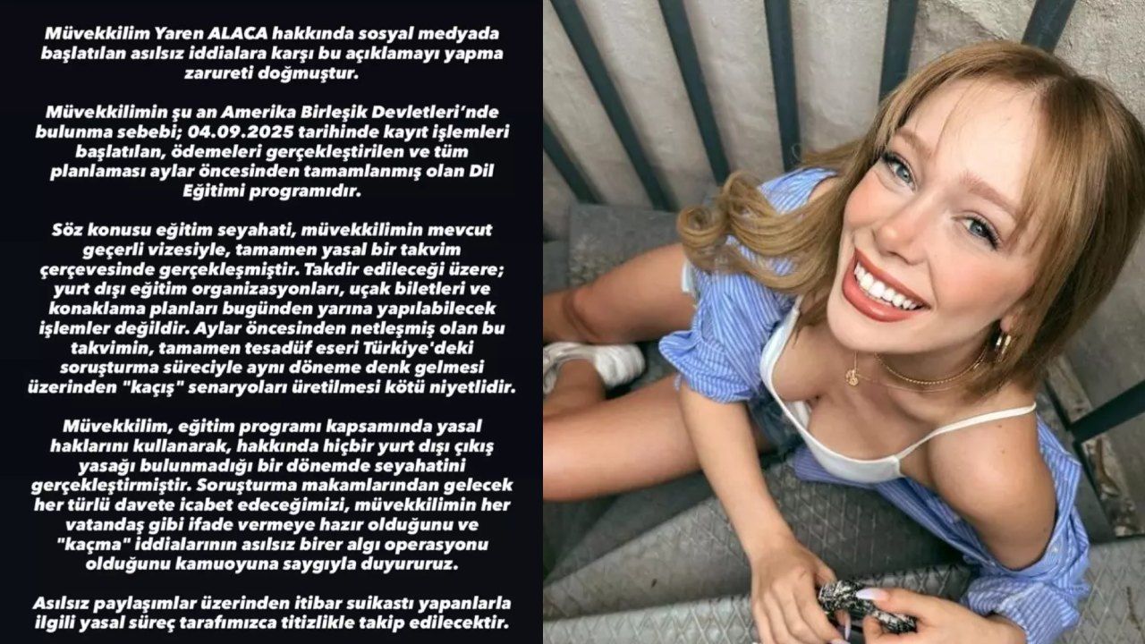 Yaren Alaca’nın avukatı da iddialara ilişkin hızlı bir açıklama yaptı. Avukat, “Aylar öncesinden netleşmiş olan bu takvimin, tamamen tesadüf eseri Türkiye’deki soruşturma süreciyle aynı döneme denk gelmesi üzerinden ‘kaçış’ senaryoları üretilmesi kötü niyetlidir,” ifadelerini kullandı.
