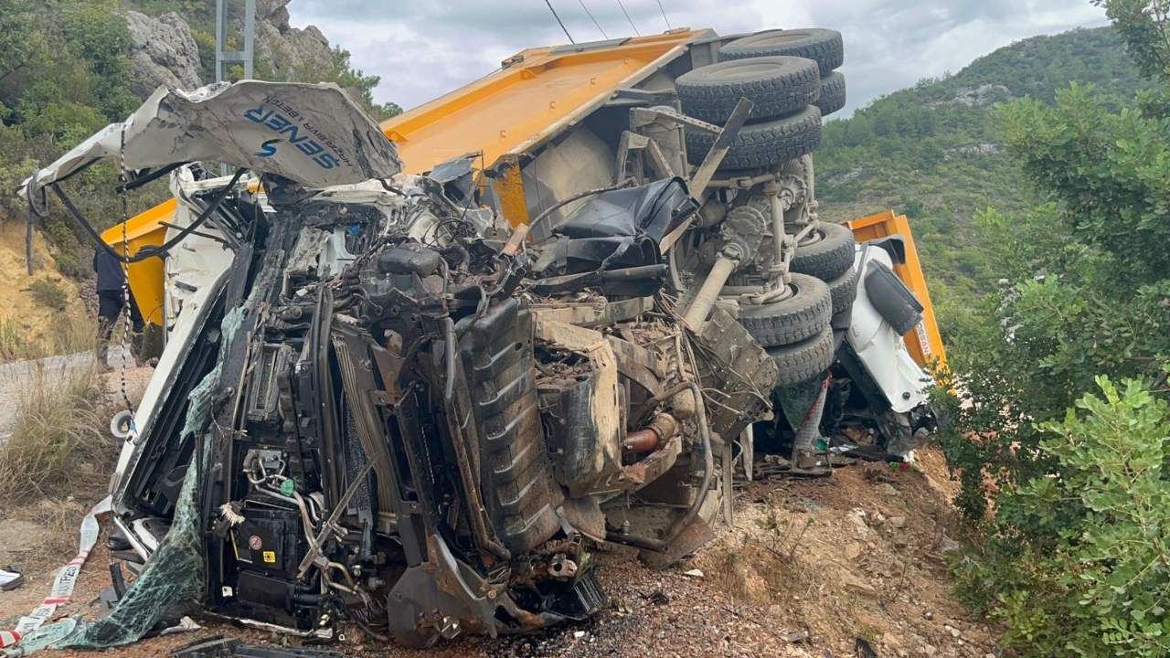 Antalya’nın Alanya ilçesinde meydana gelen trafik kazasında, freni boşalan kum yüklü hafriyat kamyonu karşı yönden gelen başka bir kamyonla çarpıştı. Kazada bir sürücü hayatını kaybederken, diğer sürücünün hayati tehlikesi devam ediyor.