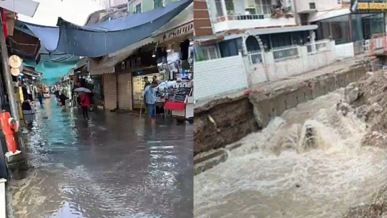 Turistik Kemeraltı Çarşısı’nda da yoğun yağış nedeniyle su birikintileri oluştu. Esnaf, iş yerlerinin sular altında kalmasıyla baş etmek zorunda kaldı ve her yağışta benzer durumla karşılaştıklarını belirtti.