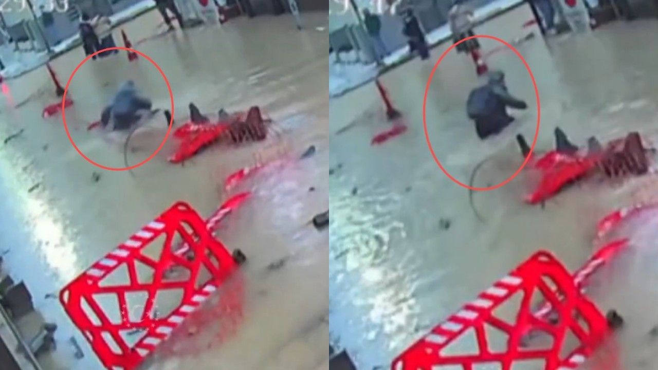 İzmir’de yoğun yağışlar dolayısıyla sokaklarda taşkınlar meydana geldi. Taşkınlar sonrasında sosyal medyada bir vatandaşın sokaktaki çukura düşmesi gündem oldu. Alsancak’ta göl haline dönmüş sokakta yoldaki çukuru görmeyen bir vatandaşın çukura düşmesi güvenlik kameralarına yansıdı.