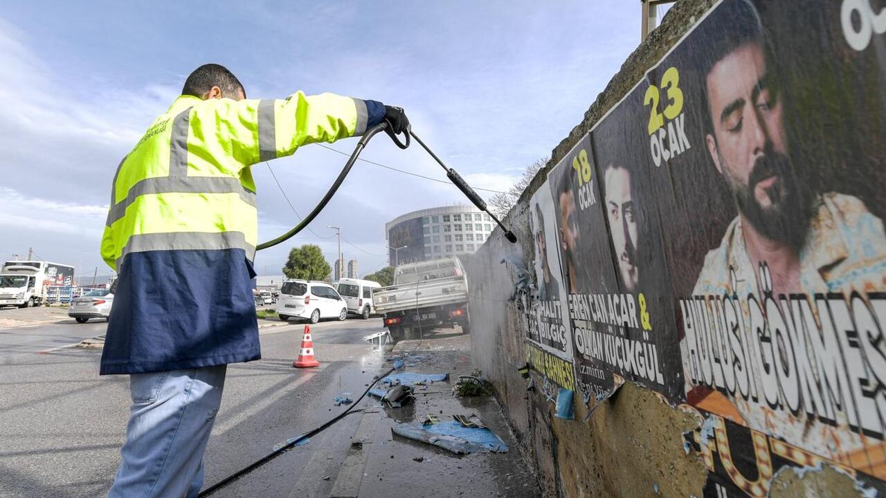 İzmir Büyükşehir Belediyesi Zabıta Dairesi Başkanlığı, kentin görsel bütünlüğünü korumak ve kamuya ait alanların amacı dışında kullanılmasını engellemek amacıyla izinsiz ilan ve reklam uygulamalarına karşı denetimlerini sürdürüyor. Şehrin farklı noktalarındaki elektrik direkleri, üst geçitler, bina duvarları ve açık alanlara izinsiz şekilde asılan afişler ekipler tarafından tek tek sökülüyor. Kaldırma işlemleriyle birlikte temizlik çalışmaları da eş zamanlı olarak yürütülüyor.