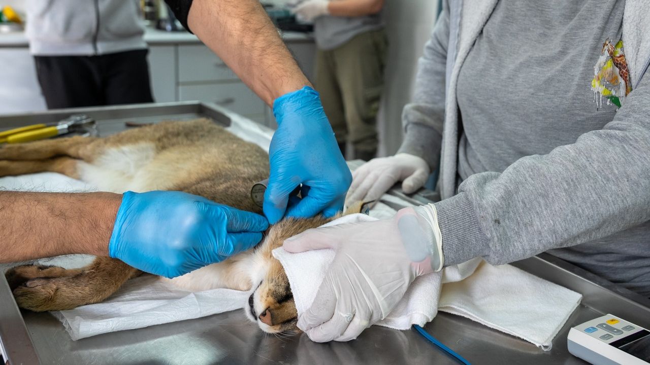 Geçen yıl 27 Ağustos’ta Aydın’da Doğa Koruma ve Millî Parklar Genel Müdürlüğü ekipleri tarafından yaralı halde bulunan saz kedisi, tedavi edilmek üzere İzmir Büyükşehir Belediyesi Veteriner İşleri Dairesi Başkanlığı’na bağlı Doğal Yaşam Parkı Kliniği’ne getirildi. Yapılan klinik ve radyografik incelemelerde hayvanda kalça çıkığı, sağ femurda parçalı açık kırık ve kalça bölgesinde kırıklar tespit edildi. Ayağa kalkamadığı ve arka bacağını sürüyerek hareket etmeye çalıştığı belirlenen saz kedisi, yoğun bakım ve destekleyici tedavilerle hayata tutundu.