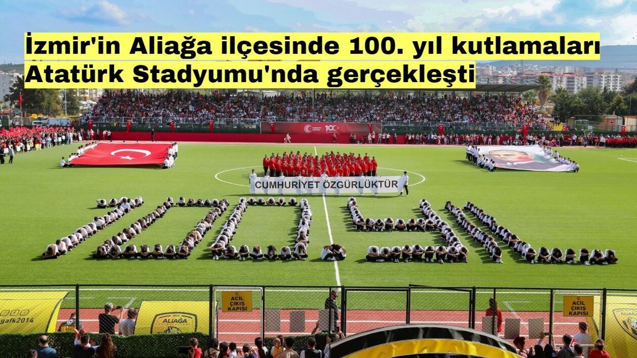 İzmir'in bütün ilçelerinde Cumhuriyetin 100. yılı coşkuyla kutlandı. Aliağa'da kutlamalar, Atatürk Stadında yapıldı. Uzun bir aradan sonra ilk kez statta organize edilen kutlamalar, yoğun ilgi gördü. Vatandaşlar stada akın ederken; öğrenciler, genç sporcular, atlı ve motorize ekipler tarafından yapılan gösteriler kutlamalara renk kattı. Aliağa Kaymakamı Zekeriya Güney, Aliağa Belediye Başkanı Serkan Acar ve Garnizon Komutanı Albay Faruk Altun, kutlamalara katılanların bayramını kutladı. Saygı duruşunda bulunulması ve ardından İstiklal Marşının okunmasının ardından, Cumhurbaşkanı Recep Tayyip Erdoğan'ın 29 Ekim Cumhuriyet Bayramı mesajı okundu.