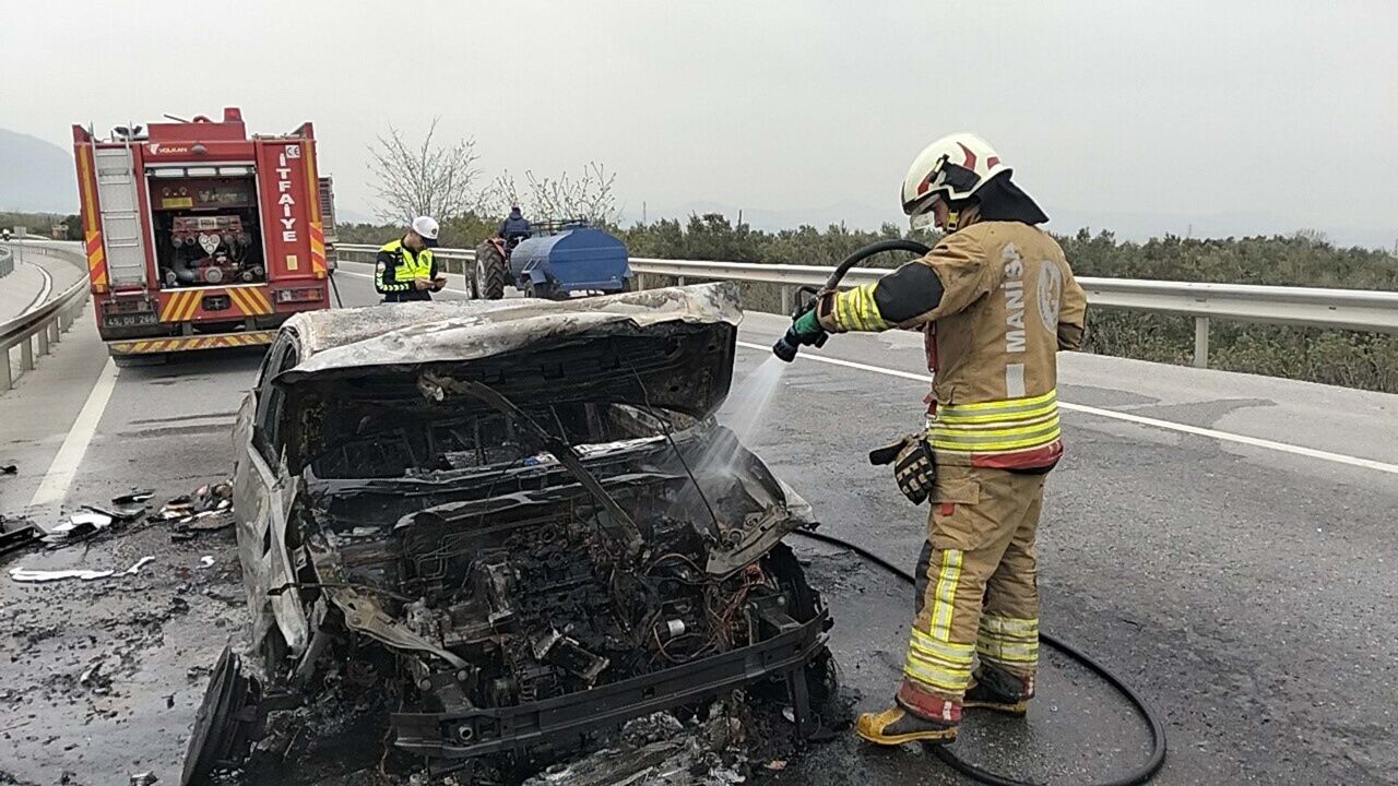 Manisa’nın Kırkağaç ilçesinde meydana gelen trafik kazasında, kontrolden çıkan bir otomobil bariyerlere çarptıktan sonra alev aldı. Kısa sürede tamamen yanarak kullanılamaz hale geldi.