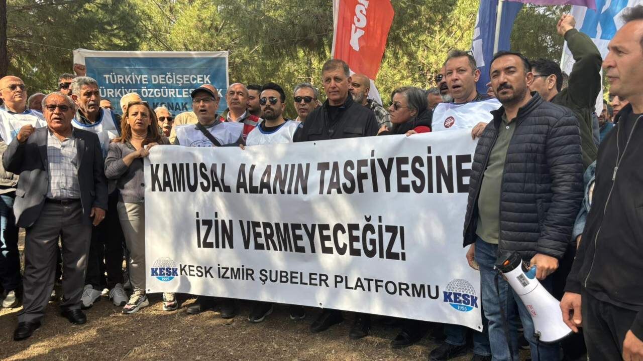KESK İzmir Şubeler Platformu adına konuşan Dönem Sözcüsü Hamdi Çalık, “KESK İzmir Şubeler Platformu olarak, İzmir halkına ait olan Meslek Fabrikası’na haksız, hukuksuz ve keyfi bir şekilde el konulmasına karşı, İzmir halkının yanında yerimizi almak için toplanmış bulunuyoruz. Ülkemizin her köşesinde köylüler topraklarını, havasını, suyunu, ağaçlarını, hayvanlarını talancılardan korumak için direniştedir, nöbet tutmaktadır. Hak savunucuları ülkenin dört bir yanında doğanın talan edilmesine, çevrenin tahrip edilmesine karşı direniştedir, nöbet tutmaktadır. Emekliler insanca yaşanabilir bir ücret talebiyle direniştedir. İşçiler, emekçiler insanca çalışma koşulları ve insanca yaşanabilir bir ücret talebiyle direniştedir. Hak savunucuları başkasına ait olanı değil, kendisine ait olanı korumak için nöbet tutmaktadır. Bizler de başkasına ait olanı değil, İzmir halkına ait olanı korumak ve kurtarmak için nöbetteyiz” dedi.