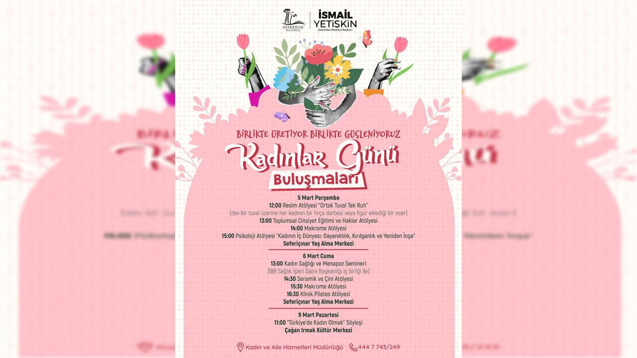 Etkinlikler 5 Mart’ta Seferiçınar Yaş Alma Merkezi’nde başlayacak. Gün içerisinde Ortak Tuval Tek Ruh resim atölyesi, toplumsal cinsiyet ve haklar eğitimi, makrome atölyesi ile Kadının İç Dünyası: Dayanıklılık, Kırılganlık ve Yeniden İnşa başlıklı psikoloji atölyesi düzenlenecek. Program 6 Mart’ta yine Seferiçınar Yaş Alma Merkezi’nde devam edecek. Kadın sağlığı ve menopoz semineri ile seramik-çini atölyesi, makrome ve klinik pilates etkinlikleri gün boyu katılımcılarla buluşacak.
