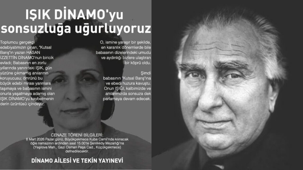 Toplumcu gerçekçi edebiyatın önde gelen isimlerinden Hasan İzzettin Dinamo’nun kızı Işık Dinamo’nun hayatını kaybettiği açıklandı. Tekin Yayınevi ve Dinamo ailesi tarafından paylaşılan duyuruda, Işık Dinamo’nun babasının edebi mirasını yaşatmaya çalışan bir isim olduğu ifade edildi. Açıklamada, zor yıllarda babasının yanında olan ve onun eserlerinin taşıdığı anlamı kuşaktan kuşağa aktarmaya çalışan bir kişi olarak anıldığı belirtildi.